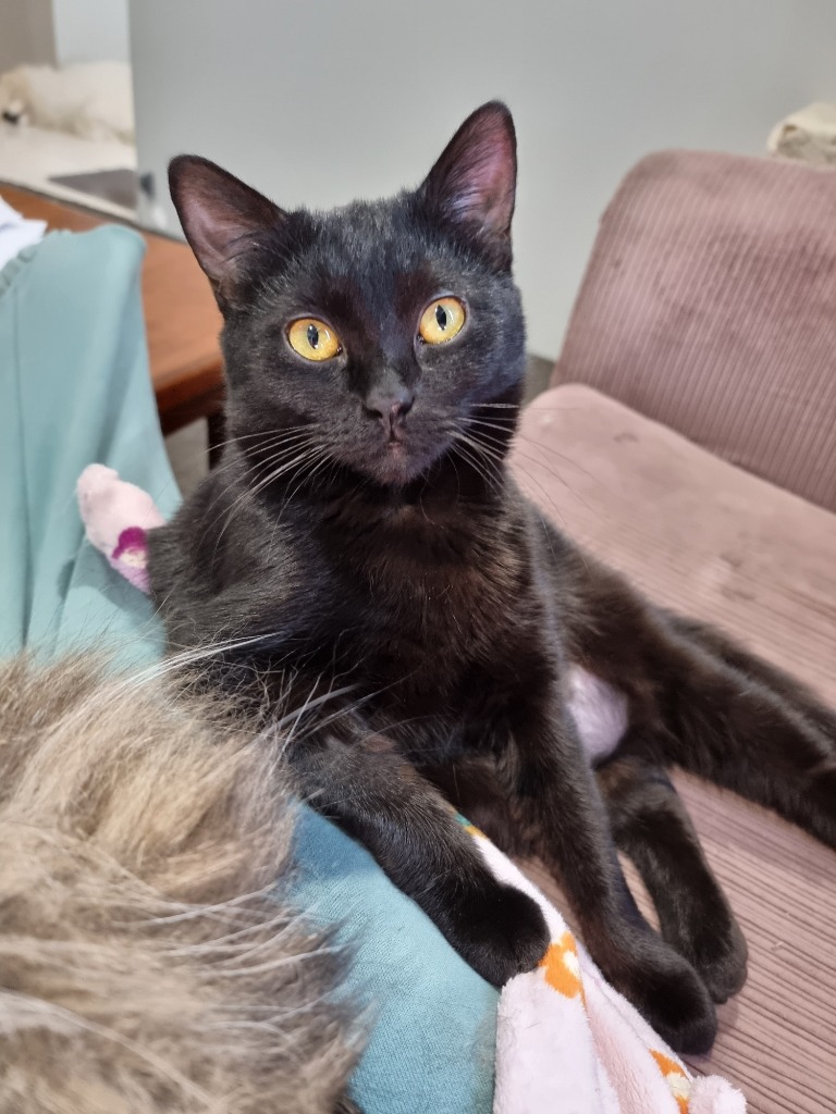 FAVOURITE THINGS: Bonnie absolutely loves pats; her and her sister Boa will head butt their foster parent's hand and demand pats as soon as they come into the room. They are both big smoochers, and enjoy getting lots of pats and cuddles and snuggling up on the couch with their foster carers. She also loves to play! Her and her sister will tear around their foster room, climbing, throwing toys around and chasing each other. Bonnie is the less agile of the two, but it is very cute watching her try to catch the toy.