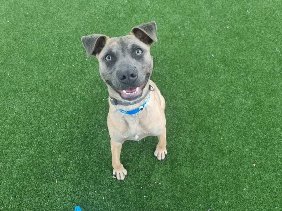 Huntah is a spirited and intelligent pup. He is looking for a dedicated and patient family ready to invest time and effort into his training. Though he is quite jumpy and mouthy when excited—he's still learning how to channel all that zest for life! He is incredibly food-motivated, which makes him an excellent candidate for training. He already knows how to sit and, with consistent practice, will undoubtedly master additional commands. His interactions with other dogs may start off as rude but he can learn manners from another dog. A family with teenagers or adults would be ideal.