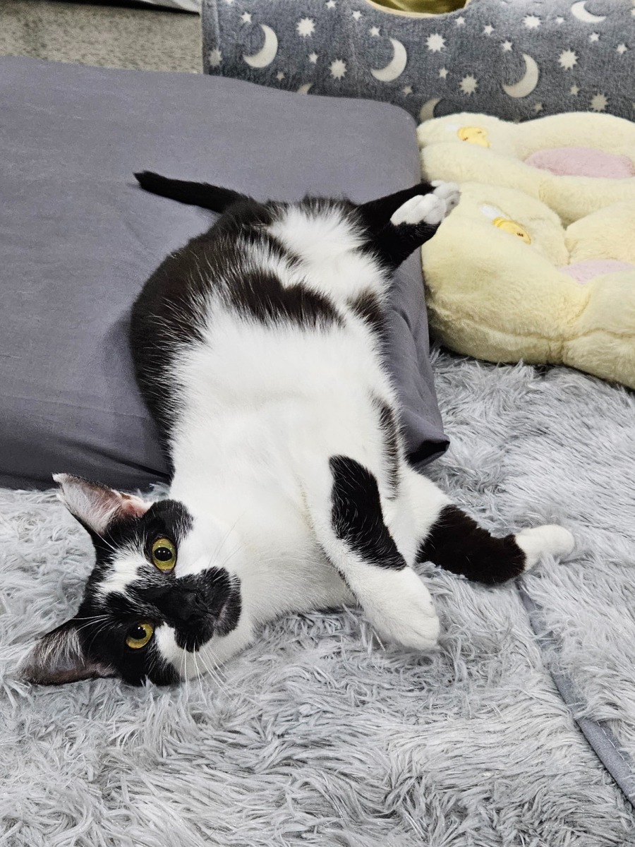 This sweet girl thrives on affection. She'll greet you with a friendly meow and immediately roll onto her back, begging for belly rubs. Be warned, resisting her charm is nearly impossible! While Tinkerbell may not be a fan of being picked up for long periods, she loves following her humans around the house, happy to be your furry shadow.