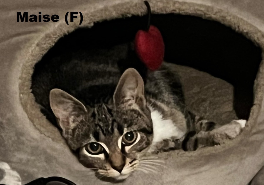 Maise has integrated wonderfully with her foster family, getting along marvelously with other kittens, adult cats, and even two small dogs. Her joyful demeanor is contagious, as she spends her days learning to play and explore her surroundings. Whether she's chasing a toy or spending time with her furry friends, Maise is always the epitome of sweetness and gentle fun.
