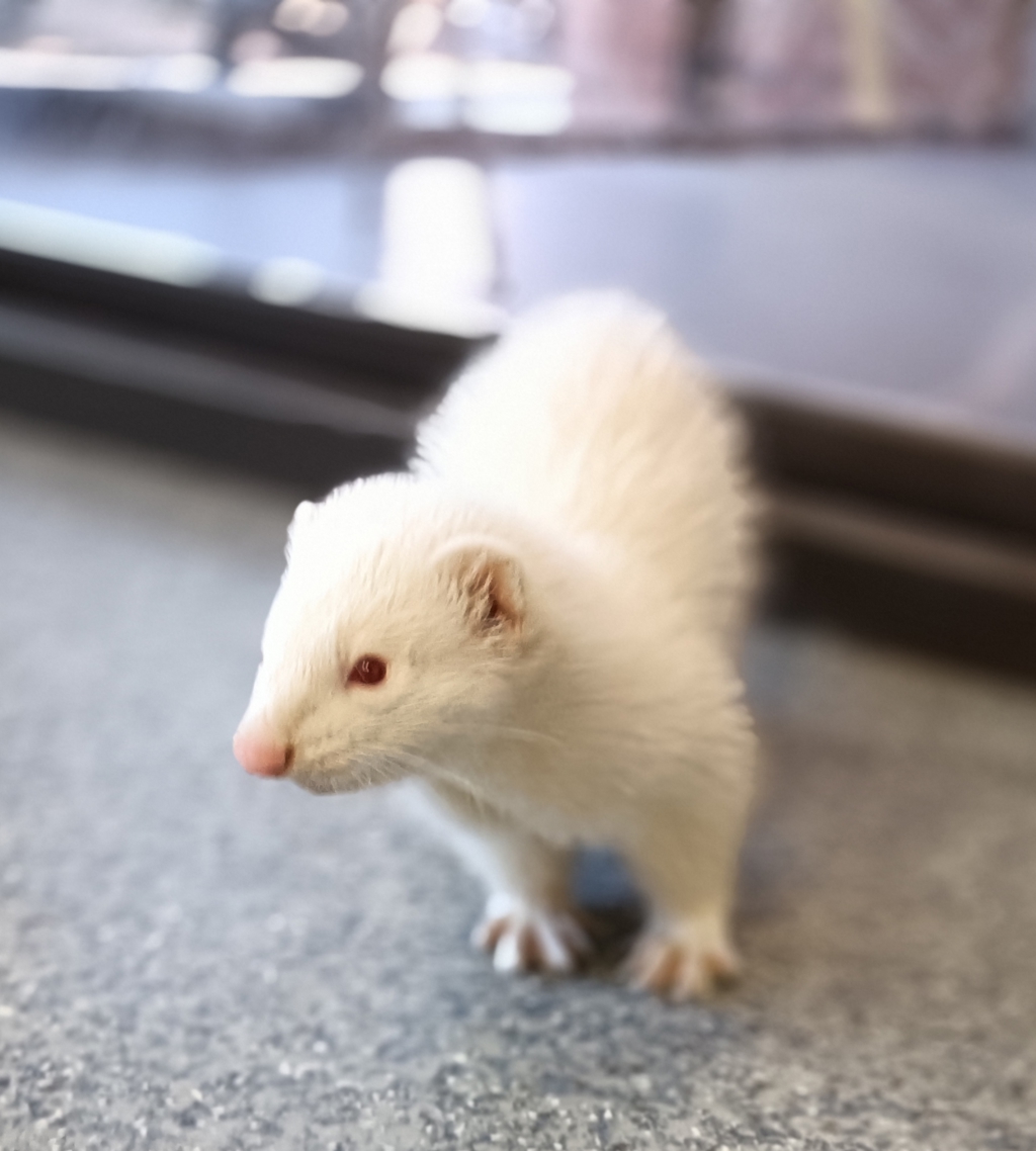 Stripe is a beautiful Albino female ferret who is full of energy and fun! She is a young girl who is always up for an adventure and loves to play with all sorts of toys. Stripe is bonded with her littermate Cane and they make the perfect pair.