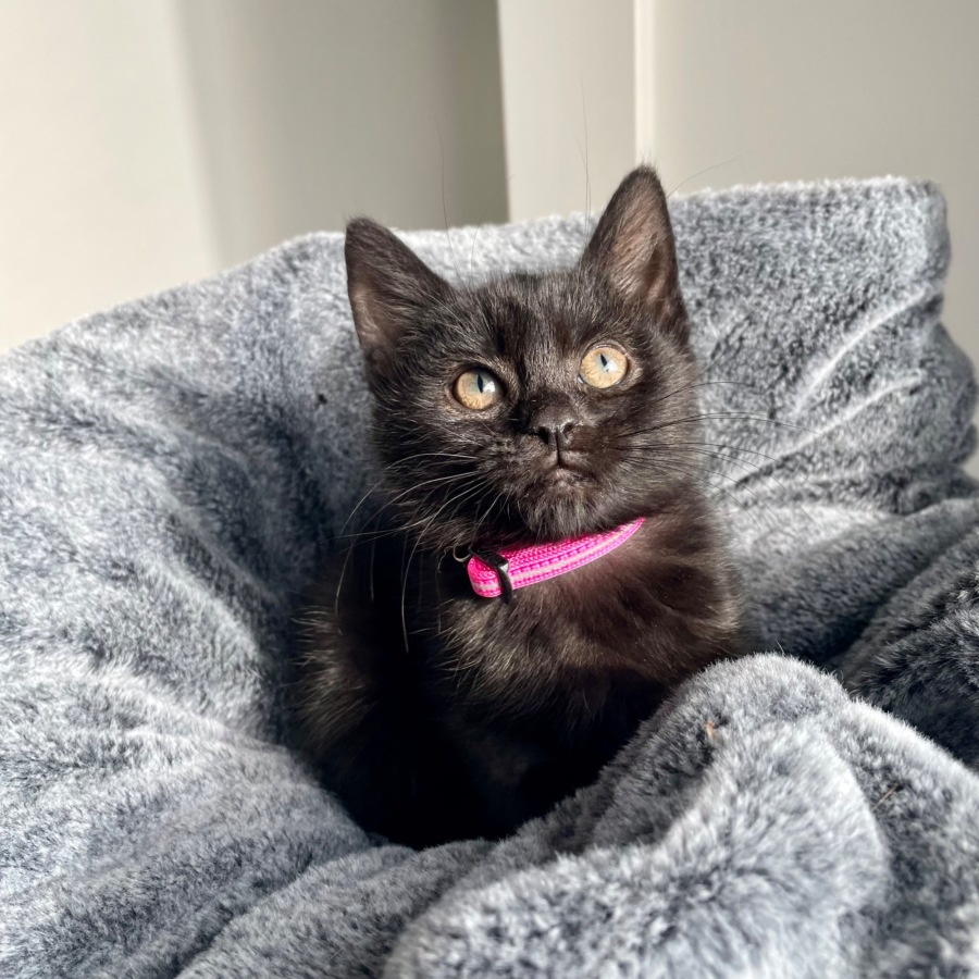 Meet Burberry, a delightful female kitten who's all set to fill your life with warmth and joy. This petite black beauty with her big, expressive eyes is the perfect package of sweetness and affection. Burberry is an affectionate bundle of love who purrs contentedly, reflecting her loving and gentle nature.