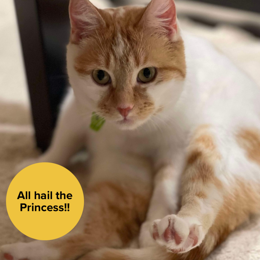 Like all princesses, she loves to be pampered and adores a chin scratch. She will bare her stomach at any given chance for a tummy pat.