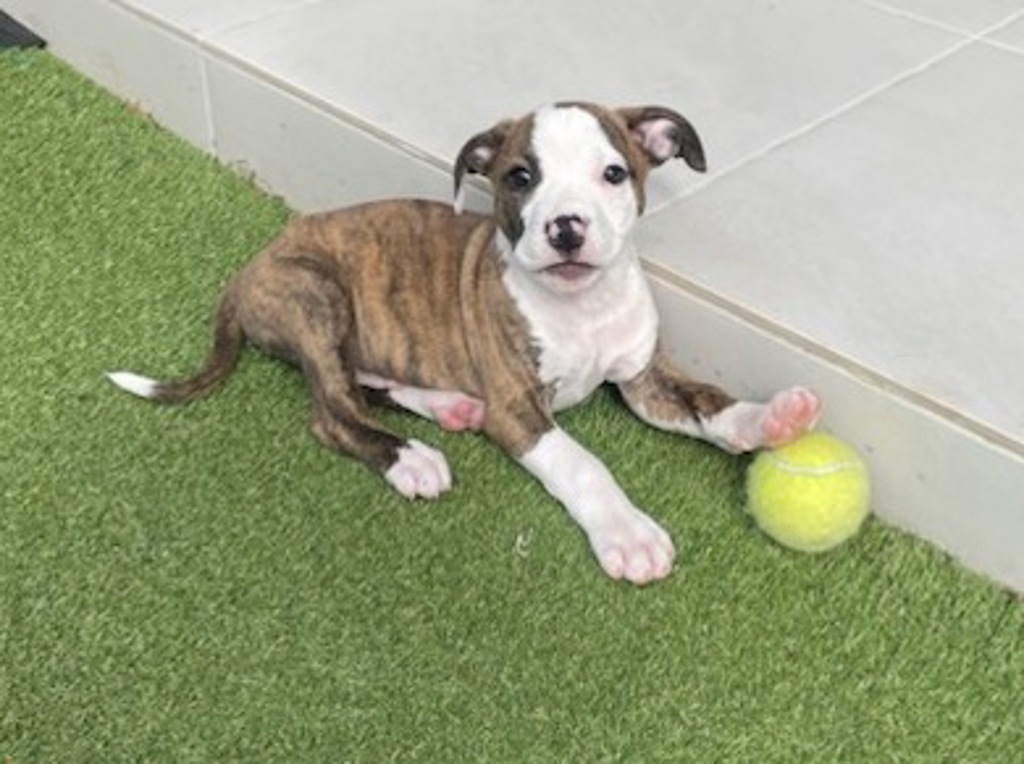 Smirnoff has been living with his sister and an adult female Staffie, so he's got the social skills down-mostly. While he's great with other dogs, his youthful exuberance sometimes gets the better of him, and he doesn't always listen when older dogs try to correct him. If you have a tolerant dog who can handle a bit of puppy energy, Smirnoff would be a perfect playmate!