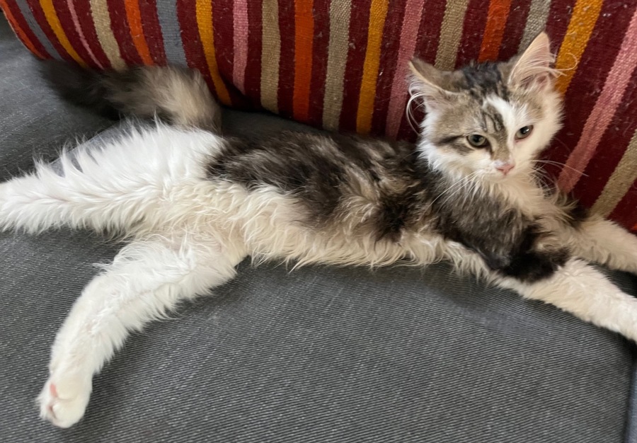 Twinnie is a 16 week old male long hair kitten with gorgeous white, black and grey/brown patterned coat of soft fur. He has light green eyes, pink nose and the most amazing ear hair tufts. Twinnie came into foster care with his three long-haired brothers. Of his family Twinnie is the most confident, and he acts as the self-appointed boss. He is the first to come forward for food and cuddles and he commands all the toys and human affection. For this reason we think Twinnie will be fine as an only pet is he has lots of human company, or he’ll equally do well in a household with a friendly dog or elderly cat companion. Twinnie is a really affectionate and playful kitten who is not fussy about food – he’ll be a great addition to your home! Twinnie has been desexed, microchipped, vaccinated, wormed and flea-treated and he’s waiting to meet you in Beaumaris 3193.