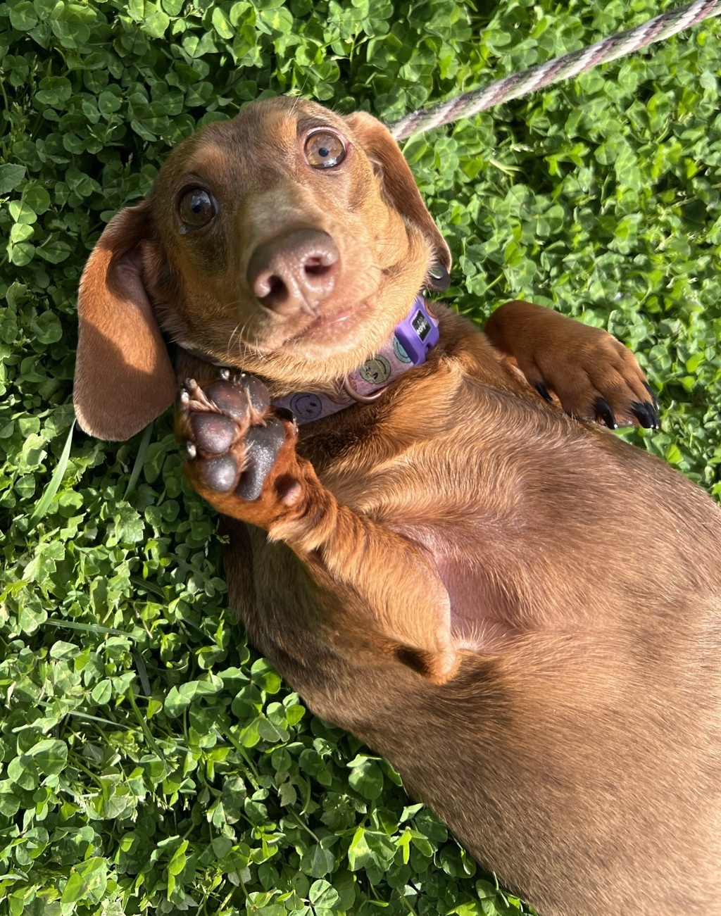 Sadie is a 4-year and 11-month-old Dachshund with a stunning chocolate merle coat.