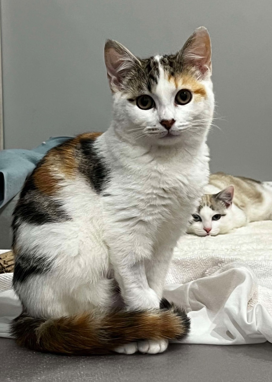 Don’t you just love a calico? Three kitty colours in one unique pattern. 🥰 Emmy is our pretty tabby calico girl with a cute dark nose and big round eyes.