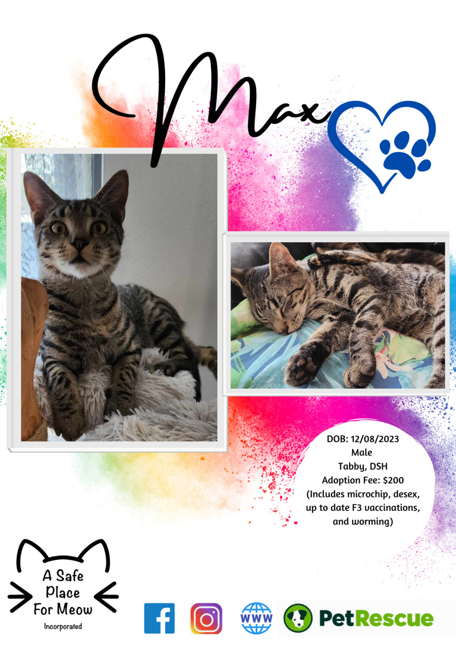 Meet Max, a super sweet and smoochy 1-year-old tabby boy whose heart is brimming with love and affection. Max is chatty by nature, always ready to greet you with a friendly meow and engage in delightful kitty conversations. His playful antics will keep you entertained, whether he's chasing a feather toy or pouncing on a shadow.