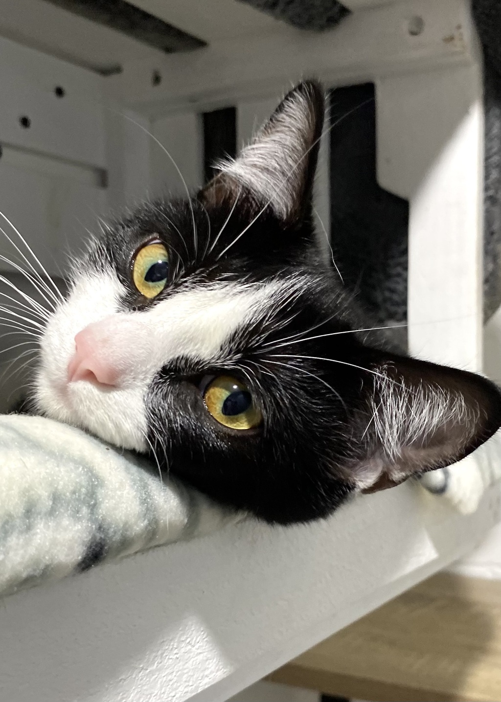 She is new to us having come from a shelter elsewhere. Brooklyn has big yellow-green eyes that will seek you out and a lovely black and white coat that is soft and thick. She is a very athletic cat who loves high places.