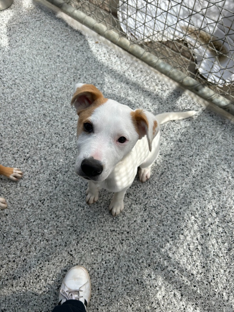 Meet Bonnie, she is a shorthaired white and tan young dog.