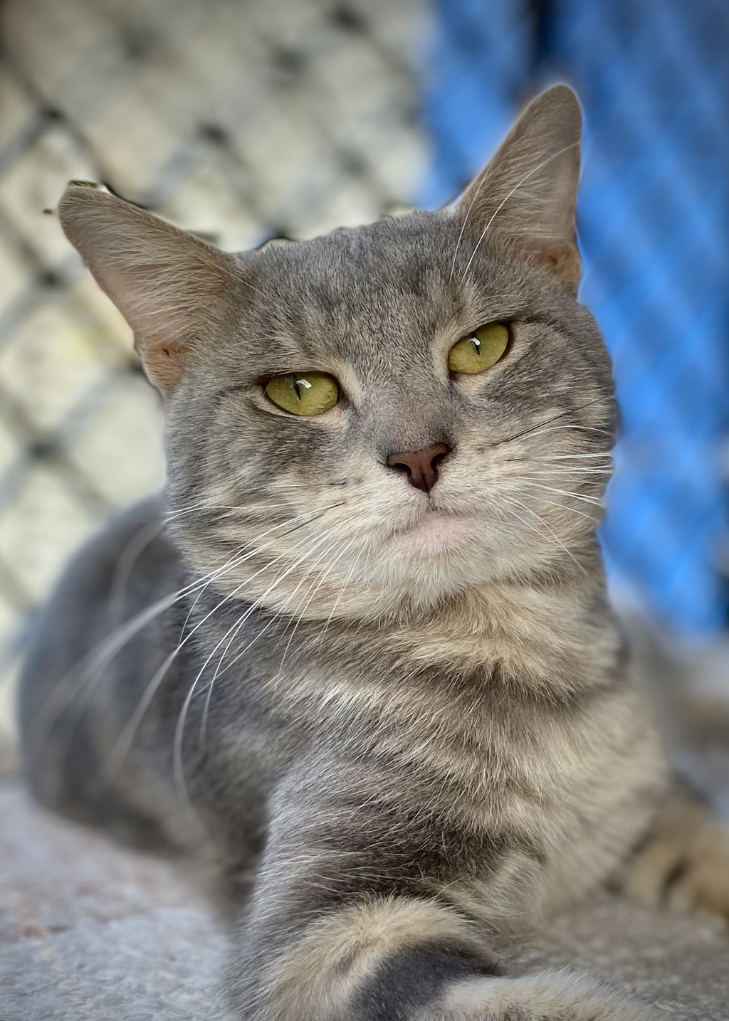 Ash is a very sweet, sensitive fellow who is coming out of his shell after having lots of loving care at our shelter. He has been recovering from the trauma of not being well cared for and having many fights with other cats in his environment. As you can see from his photo, he is a beautiful grey tabby colour with soulful yellow eyes.
