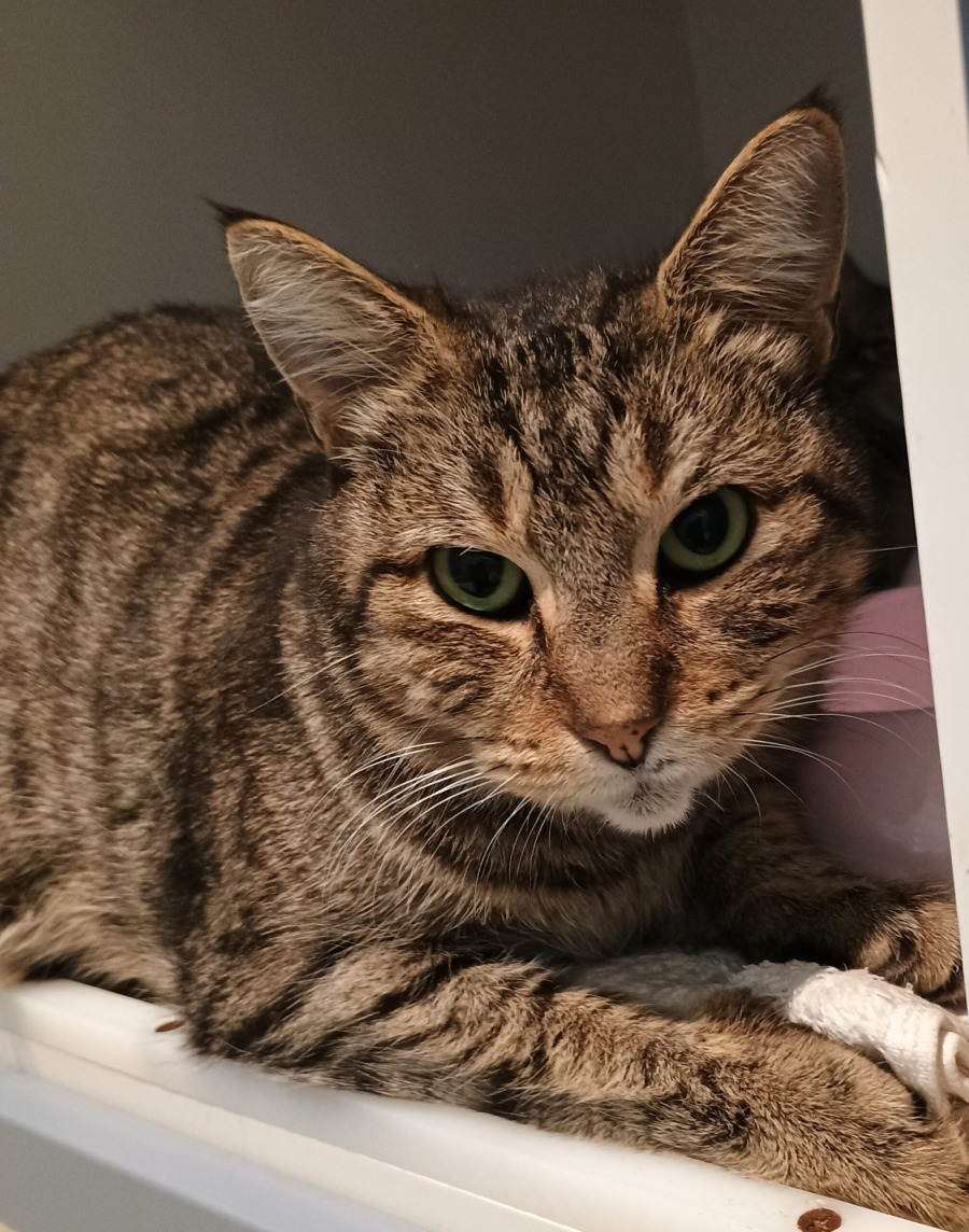 Meet Jessa, a lovely brown tabby with a heart full of affection. Just one year old, this young mum has already shown her gentle and caring nature by being a devoted mother to her only kitten, Belle. Jessa is a straightforward and friendly cat who enjoys being stroked and is happy to be picked up. Her affectionate personality makes her the perfect companion for anyone looking to add a loving feline friend to their home.