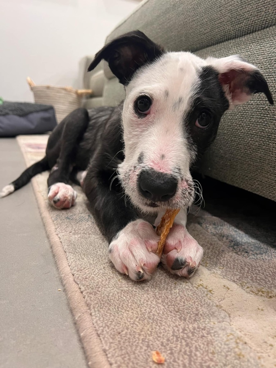 Socks has come from a rough start in life. She found herself surrendered to a rural facility in far western NSW very unwell. Socks was suffering from a temporary immune disorder known as puppy strangles so we rushed her to Sydney to get her the veterinary care she required. That wasn’t all that faced this little fighter though, she also had a broken leg. But not to worry as we fixed her all up and she will have not ongoing effects to her health. Socks would benefit from being on a joint supplement throughout her life to support her growth and body through all the fun she will get up to in her life.