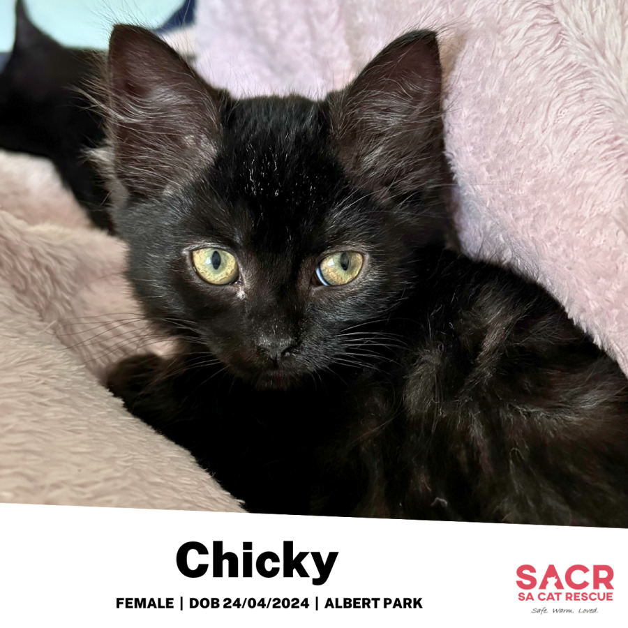 Chicky's adoption fee is $195 which includes desexing, microchipping, parasite prevention, and initial F3 vaccination.