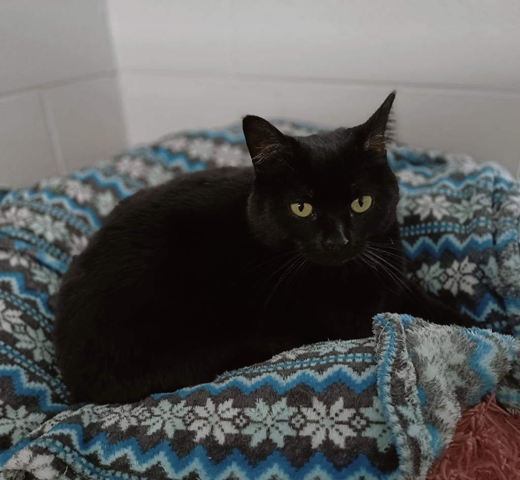 Meet Savannah, a sleek and sophisticated black cat with a heart of gold. This beautiful female feline is the perfect mix of smoochy and sometimes sassy, making her a fun and entertaining addition to any home.