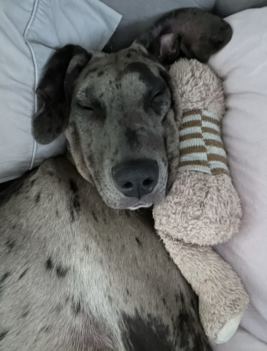 Sam loves his chew toys and regularly chews on them.