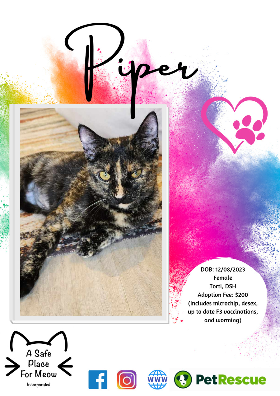 Piper is a quiet and smoochy cat who is ready to bring warmth and love into your home. With a calm and friendly demeanor, Piper is the perfect companion for anyone looking for a laid-back yet affectionate feline friend.