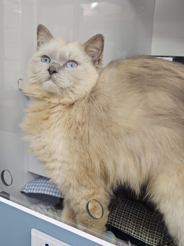Introducing Phantom, the purrfect companion you never knew you needed! This young Ragdoll X may have a mysterious name, but there's nothing spooky about him-except how fast he'll steal your heart! With his gorgeous fluffy coat and striking blue eyes, Phantom is the ultimate cuddle bug who's always ready to shower you with affection.
