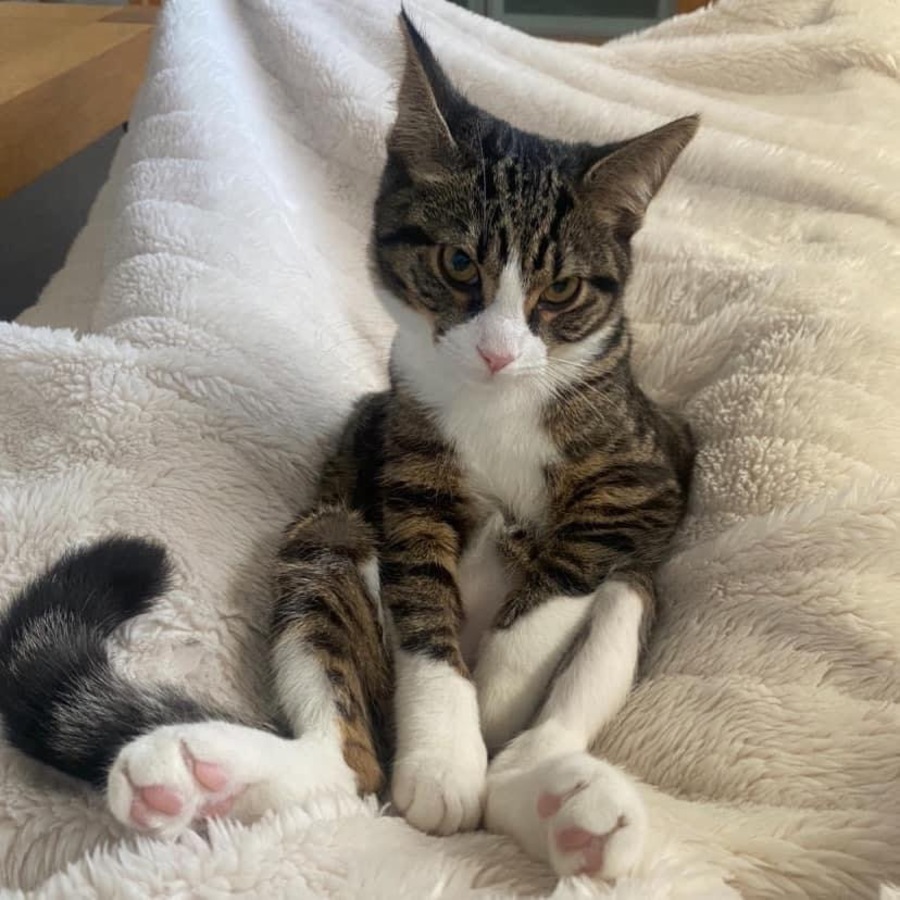 I love playing and doing zoomies around the house when I’m not on a lap and that’s not very often. I am a very chilled dude who is very relaxed around other cats, kittens and the dog. I am a fairly quiet kid as well until I hear Mum get my dinner bowl out and then I let her know I’m ready with a big meow!