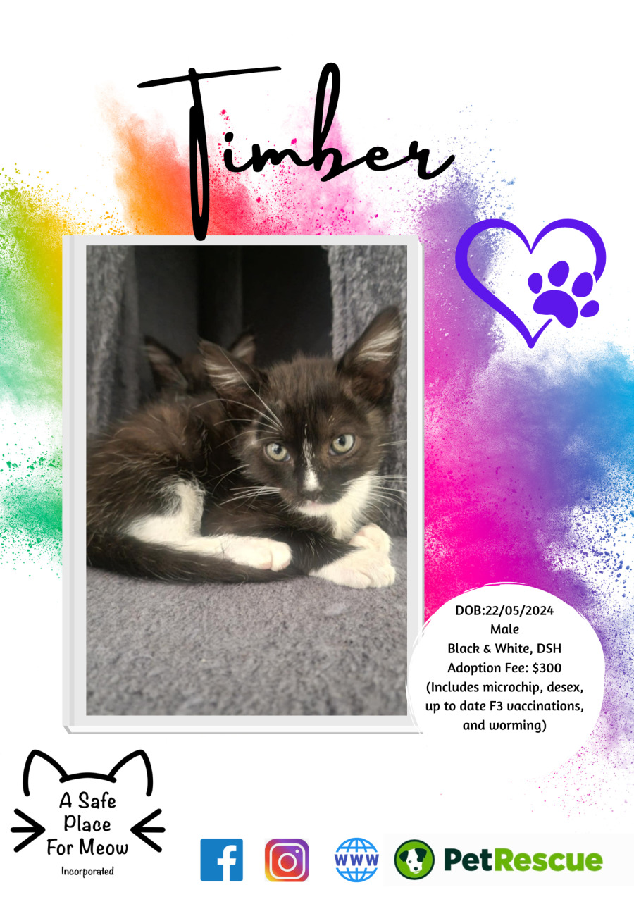 Timber is a real mummy’s boy who just loves company, snuggles and playtime. Timber and his brother Bo were brought into our care as tiny 3 week old bubs who were bottle fed by their wonderful foster mum so they are extra smoochy and cuddly.