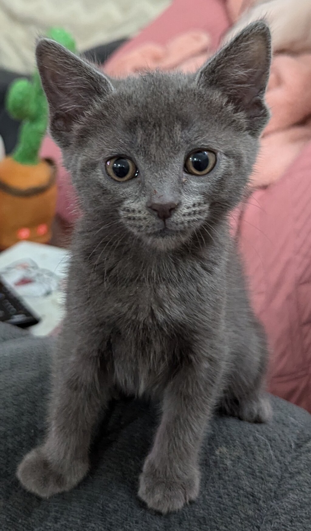 Good meowning! I'm Mishka, and I know you're already smitten-just look at my stunning blue coat! What can I say? I'm the purrfect little kitten. I'm as sweet as they come, loving cuddles, kisses, and especially long naps on your lap. I might have a cheeky side, but that only adds to my irresistible charm!