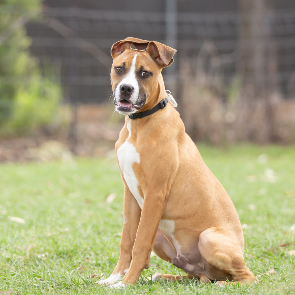 I'm a boxer cross, looking for my forever family! I love to play and have a fun time, whether it's chasing balls, romping around the yard or just going for a walk. I'd love it if my new family could take me on plenty of adventures, and let me explore what's going on in the world with my curious young mind.