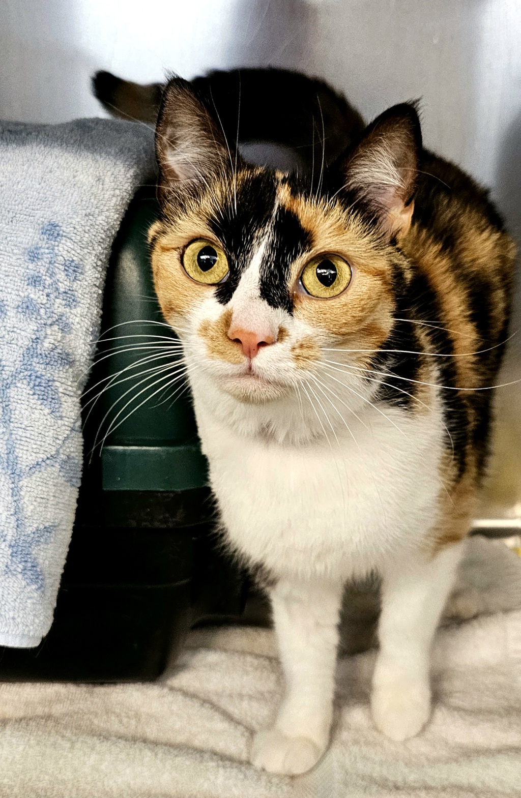 Freya is a beautiful calico cat with a shy and quiet demeanor. Despite her initial timidity, she is incredibly sweet and affectionate once she warms up to you.