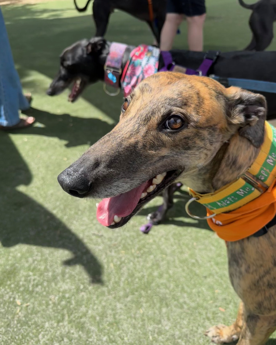 Buddy is, as his name suggests is ready to be your new best friend! This beautiful brindle boy can be a bit reserved on first meeting, but he loves deeply, and once he has fallen for you he really would prefer to be by your side as much as possible. If you are out for a trip to the shops or a spot of brunch, Buddy is happy to wait at home alone for a few hours after a good walk and left with a chewable treat like a pigs ear. (be aware you may come home to find he’s made a collection of items of your clothing in his bed. He especially loves shoes) Buddy is also happy to share his home with another suitable hound for company. Buddy is currently in a foster home with a male greyhound and they get along very well.