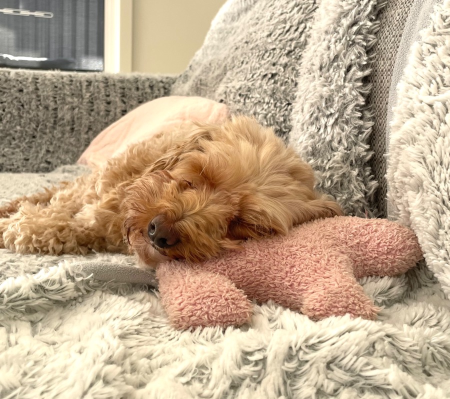 Faith is house trained and sleeps all night without a peep .