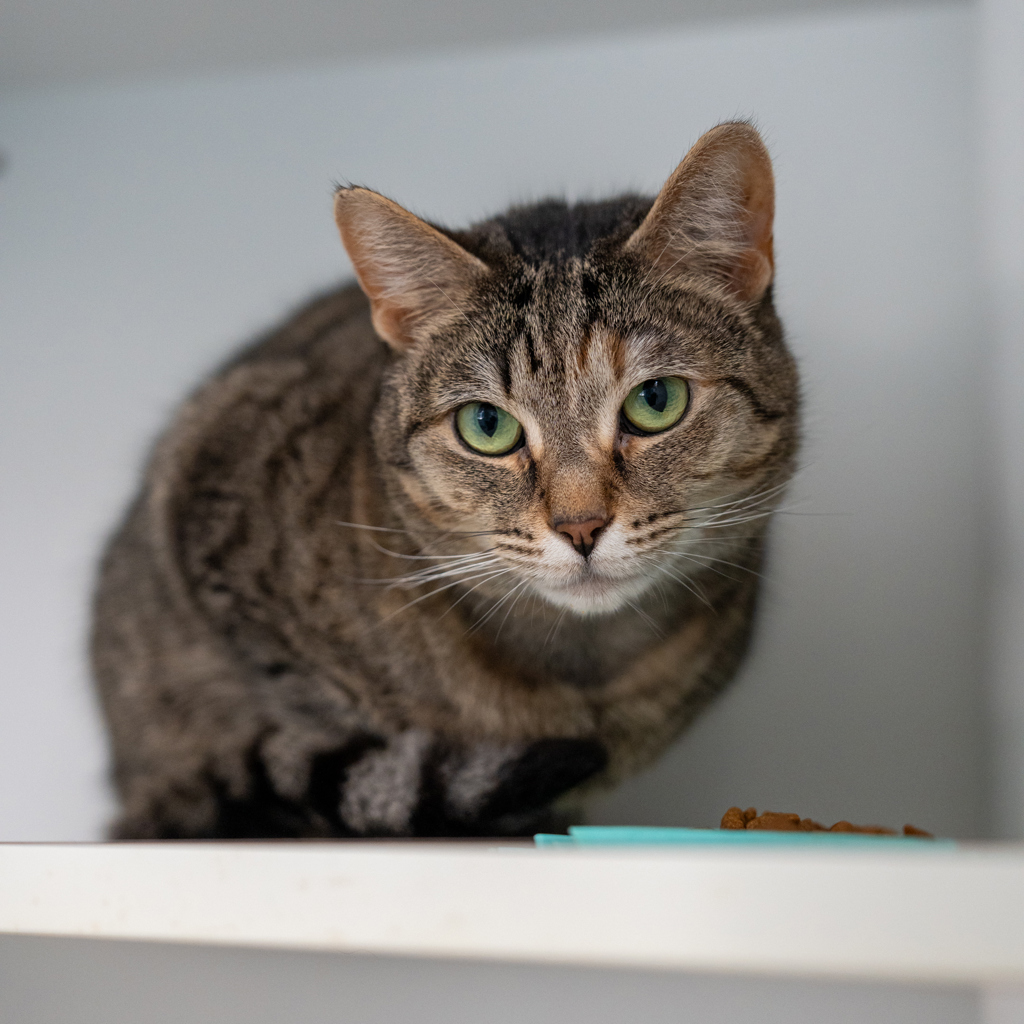 Nibbler is very easy to handle and enjoys spending time with people. She is affectionate and loves attention, often seeking out cuddles and petting. Nibbler is an active and playful cat. She enjoys interactive play sessions and is always up for a game of chase or pounce. She also appreciates a good nap in a sunny spot. True to her chirpy nature, Nibbler has a range of vocalizations that she uses to communicate. Her chirps and purrs are endearing and add to her unique charm.