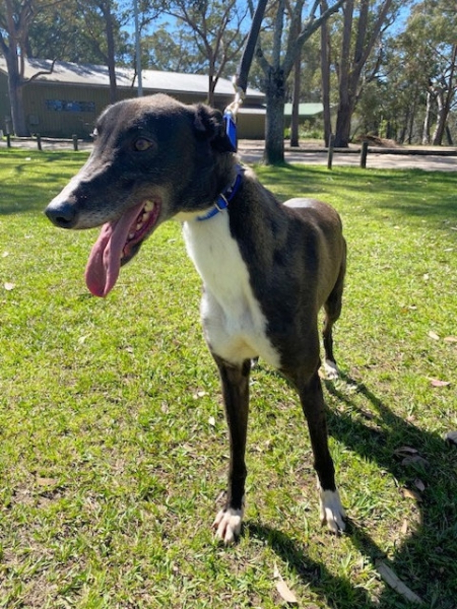 Hi, my name is Maximillion - but you can call me Max for short. I am a playful, energetic boy who had a grand total of one race start. I was very fast (for the first part of the race) but nobody told me I had to keep going in the same direction, so I decided to turn around & run back the other way just for a laugh! Can't you see that glint in my eye? I can be a bit cheeky at times but that's just because I'm pretty smart. My foster carers are amazed at how quickly I have learnt to use the doggy door (mastered it in less than 24 hours). And I am a natural born sitter too. My lead manners were close to non-existent when I first arrived but I’m pleased to say that I’ve been practicing diligently every day & now I walk nicely on a loose lead – well, most of the time….