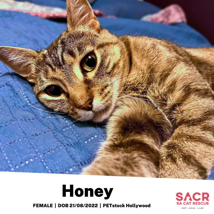 Meet Honey, a kitty with the heart of a lioness and the sweetness that lives up to her name. Having traveled an incredible 1,500 kilometers from Amata, near the Northern Territory border, Honey's journey speaks volumes about her resilience and adaptability. Now she's ready to swap bush adventures for the pampered life of a house cat.