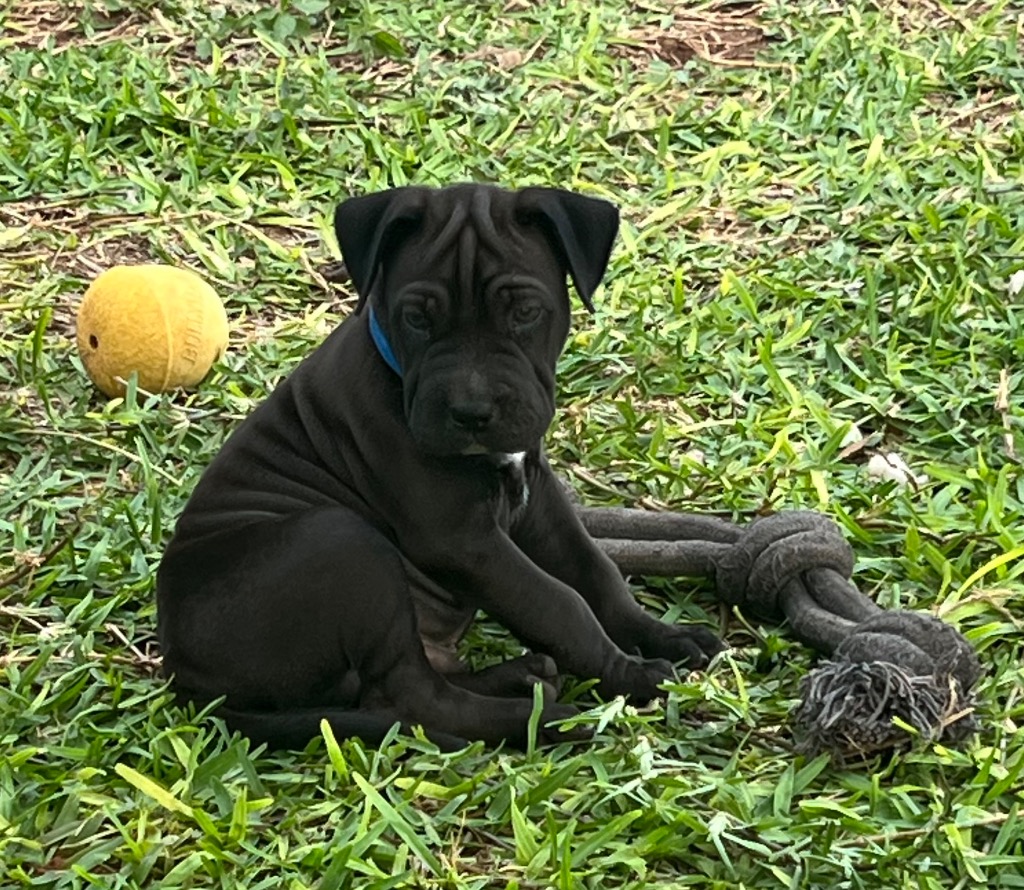 The big chunky fella of the litter . Lots of wrinkles and lots of chunk . Is the leader . Should be a compact medium size when fully grown . Very handsome and robust . Will make a good camping buddy and tag along. Cute and cuddly . Not going to be head of security .
