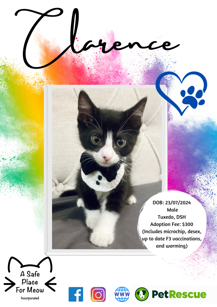 Meet Clarence, a snuggly little kitten who's still discovering the world but has already mastered the art of cuddles.