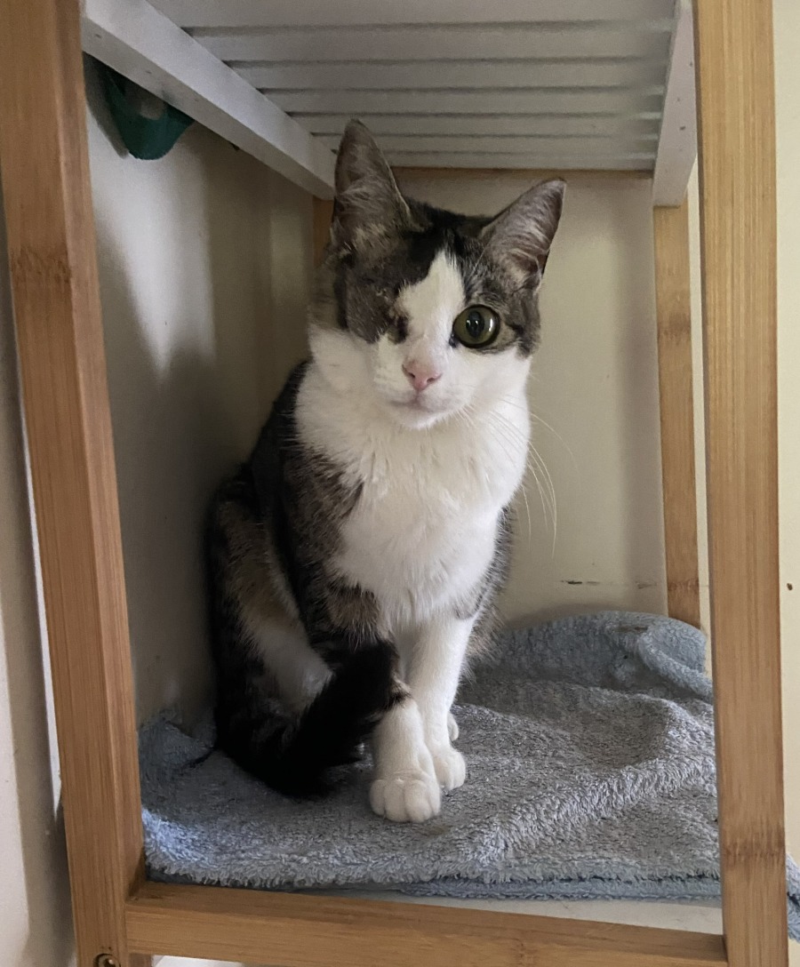 Meet Possom, a sweet and petite feline companion who may be a little shy at first but blossoms into a loving friend once she feels secure in her surroundings. This gentle lady is a testament to resilience and grace, having overcome the loss of an eye due to a past injury. Despite this, she navigates the world with ease and shows no signs of being held back by her unique feature.