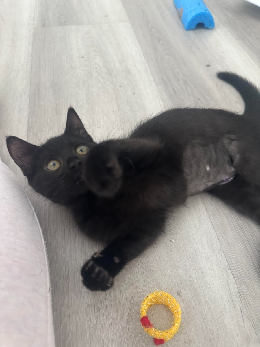 Hi everyone! My name is Geneva and I was born 07/07/2024. I'm a beautiful short haired all black kitten with a huge personality. I love to cuddle and my purr engine gets going fast but I also love to play big time! I'm the mischievous one of my litter and I'm always darting for the door when it opens. Got to be quick with me around! 😺❤