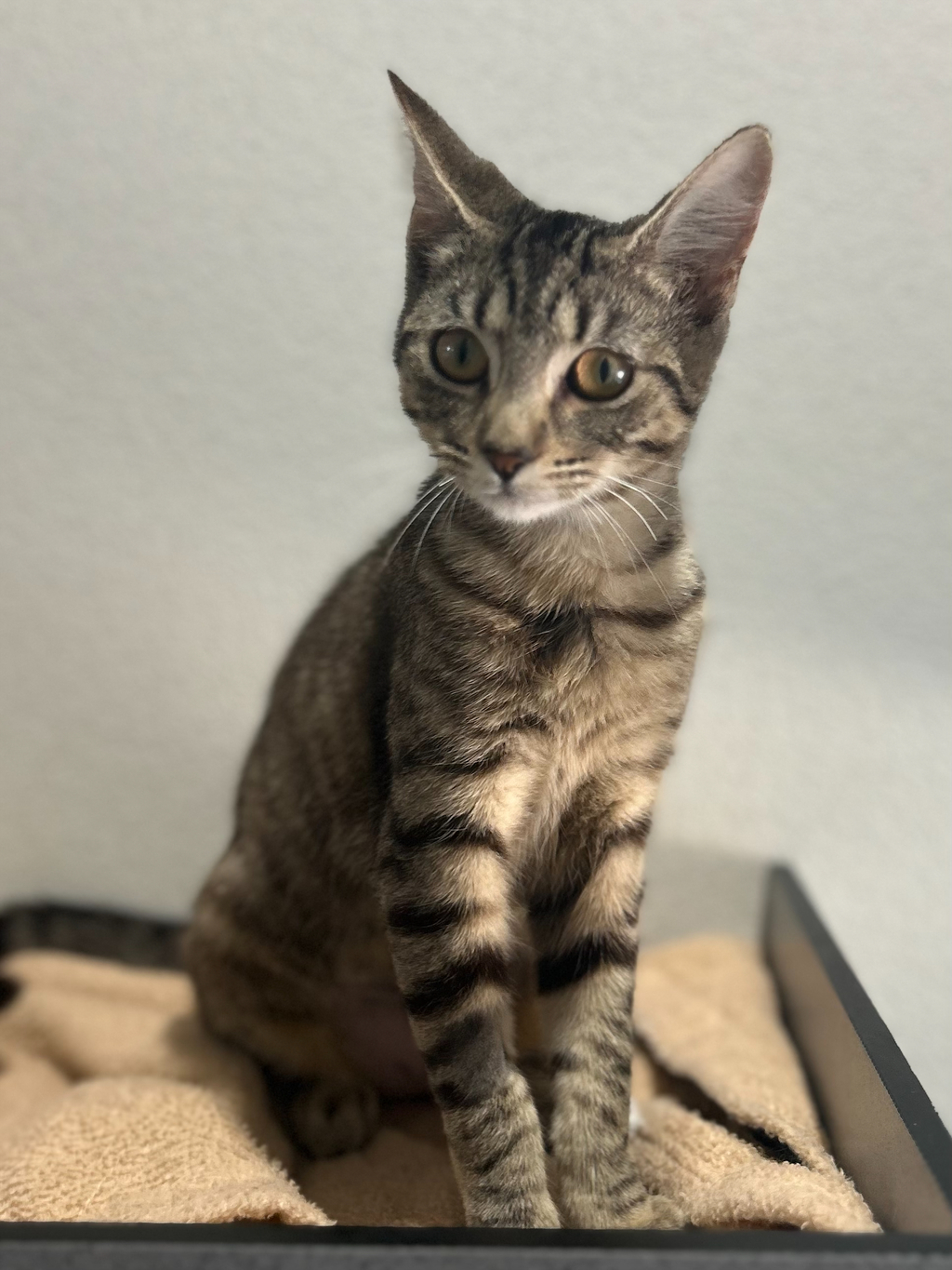 I'm a young spirit, full of love and playfulness. I adore gentle strokes and warm laps, and I promise to purr in contentment when I'm cuddled up close. I'm friendly with everyone I meet, my sweet nature shining through. I love chasing toys, my playful side is endless. But don't worry, I'm also very gentle, ensuring our playtimes are always fun. I'm looking for a forever home, a place where I can share my love and joy!