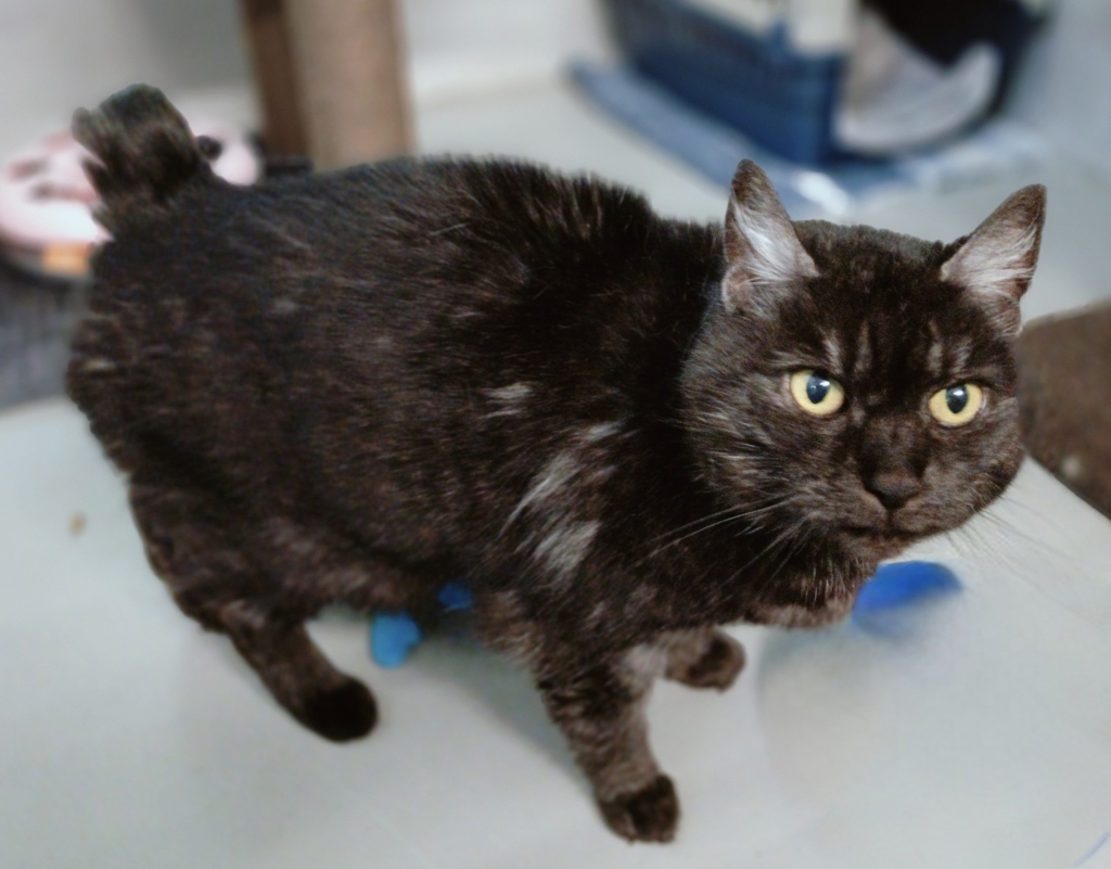 Meet Opi, a handsome 9-year-old male domestic medium hair with a unique black smoke coat. Opi is truly one of a kind with his stumpy tail and stunning coloring.