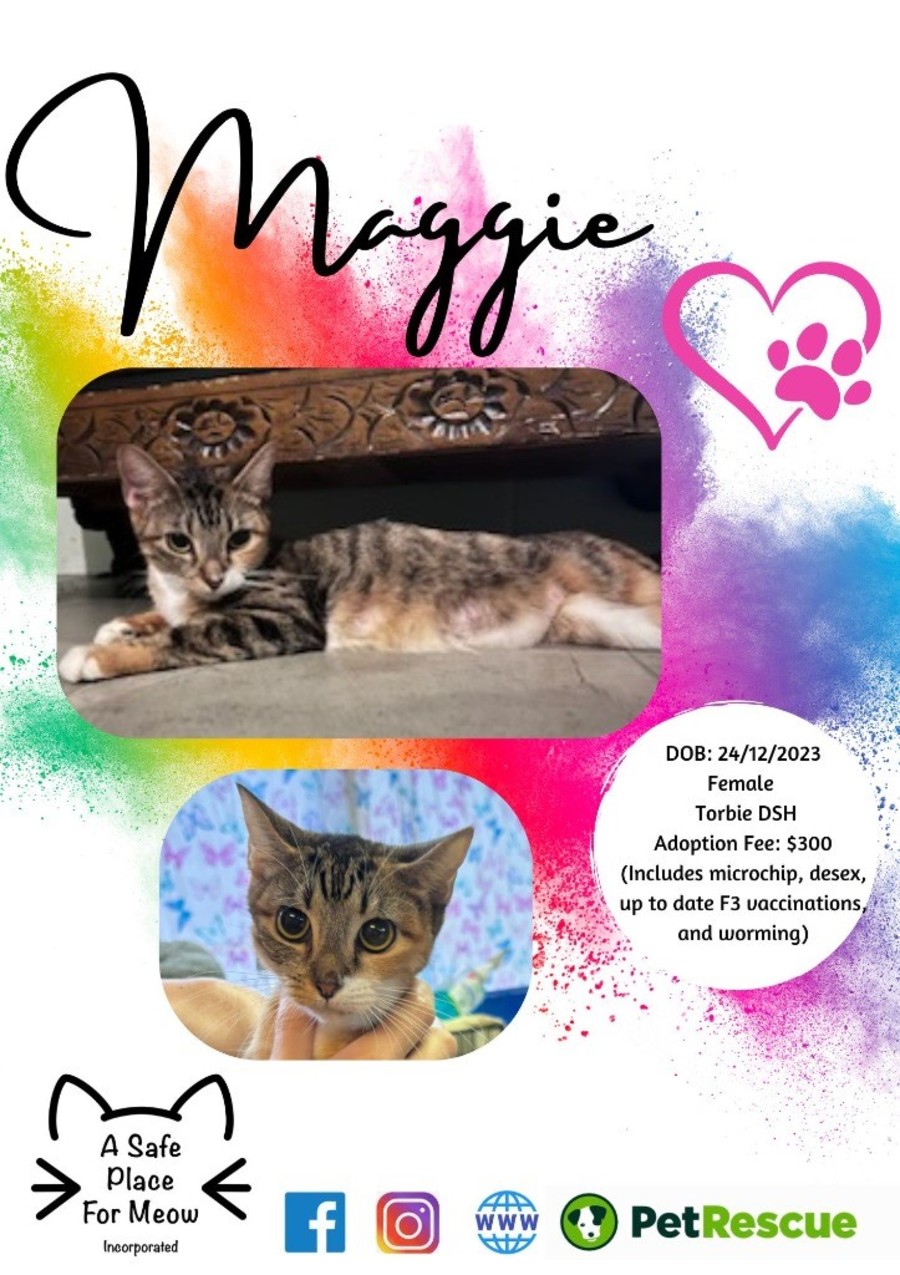 Shy yet sweet, Maggie has a gentle soul that will undoubtedly capture your heart. While she may initially be cautious, with time and patience, Maggie will blossom into a loving and affectionate companion. She enjoys peaceful moments and will thrive in a calm and understanding home where she can feel safe and secure.