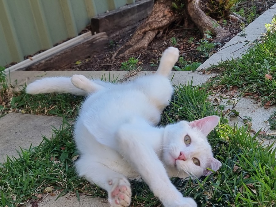 Ben is a white cat who is deaf. This does not impact his full enjoyment of an indoor-only life.