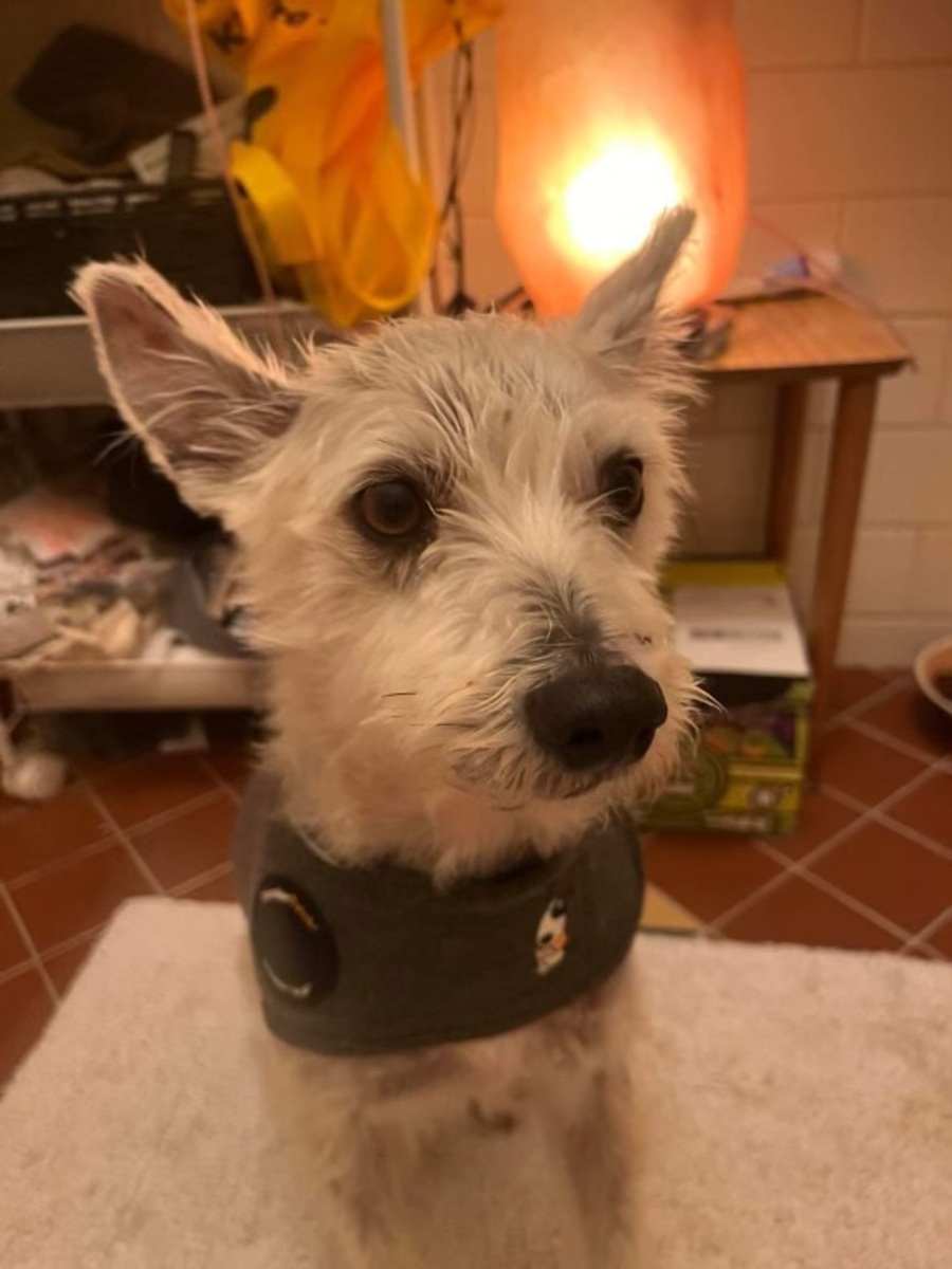 My hair looks a little crazy right now, but that’s because my previous owner groomed me himself, I’ve got a couple of cuts from that unfortunately which might mean I’m a bit scared of grooms in the future- but I do let my foster parents cuddle, kiss my head and pick me up no issues.