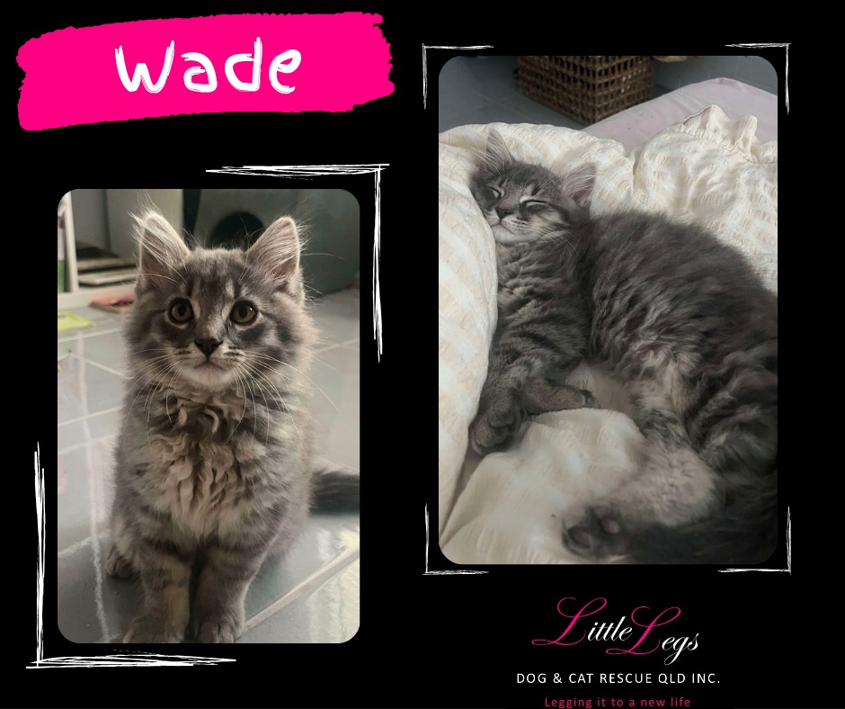 Wade is one of the sweetest kittens this foster family has met. He has sturdy legs, a magnificent tail, eyes outlined in white fur and a downy belly. Wade loves to hang out with his humans whether they are working on the laptop, relaxing watching a movie or having a nap. He adores being cuddled and brushed and has the loudest purrs. Wade loves his food and has recently discovered yummy cat treats. He will truly be adored by his forever family!