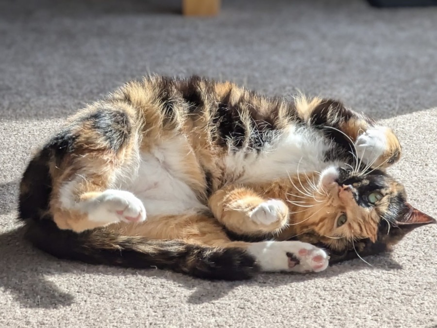 She is an absolutely beautiful cat with gorgeous markings and a fluffy white tummy. She loves to play with the wand toy and lie in the sun.