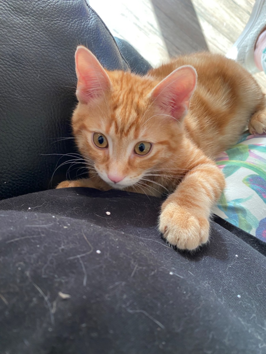Merida is nothing like her namesake from Brave… she is sweet and loves nothing more than being a lap cat and getting scratches and pats. Her 3 brothers are her best friends but she has fitted in famously with the adult resident cats often found snuggling in the sun with them. She has had no dog contact but has survived toddler attention with no scratches given.