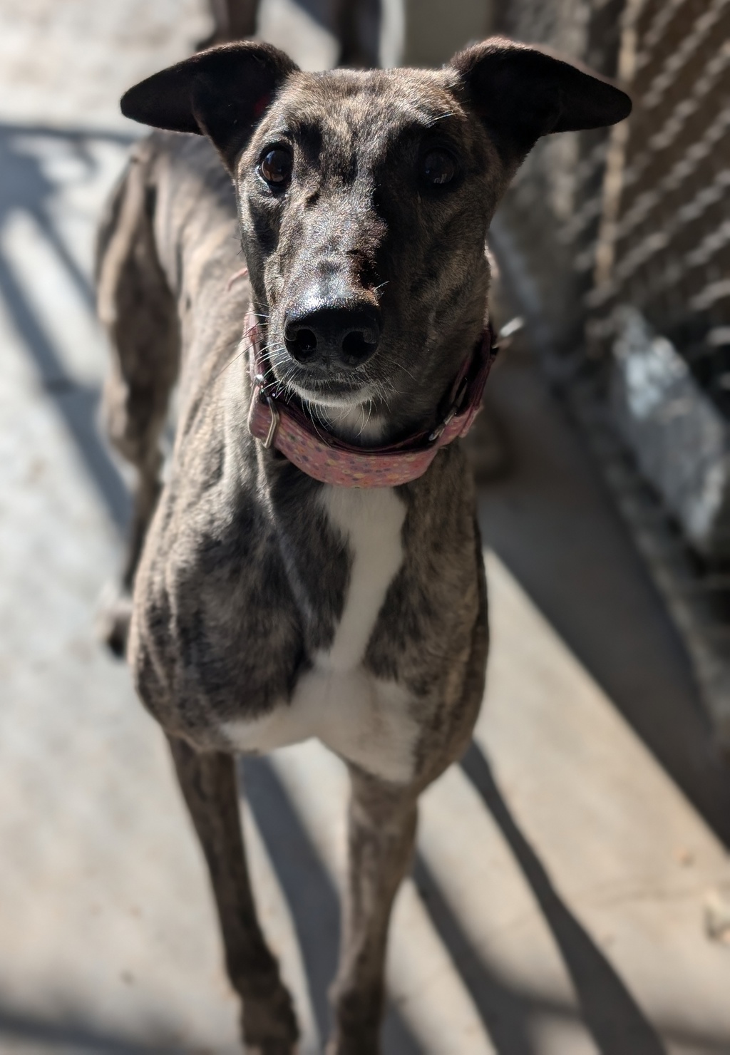 Meet the dazzling Mumma Moo Shaka, a 2-year-9-month-old brindle Greyhound who's retired from the track but still has all the energy and excitement of a top racer! Mumma Moo is a playful goofball who loves nothing more than darting around with her favorite toys, even though she hasn't quite grasped the concept of fetch-why bring the toy back when you can keep playing with it on your own?