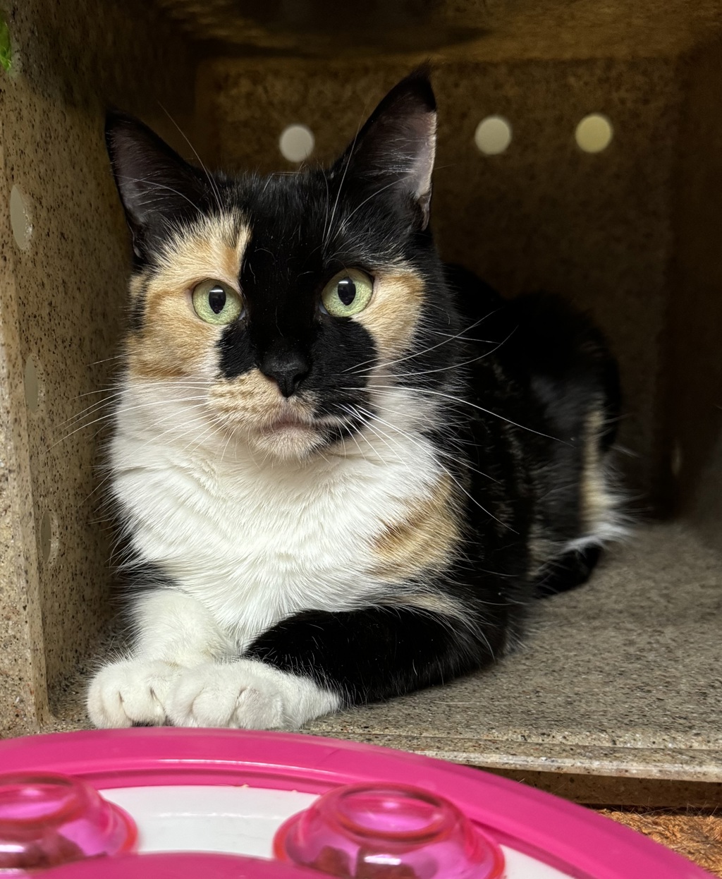 Saffron is a gorgeous girl who has come a long way since arriving at the shelter as a stray and is now on her journey to trusting people. Still being hand shy, the way to her heart is creamy dine treats and she will occasionally let you pat her if you have that on offer. Saffron is still weary of new people and isn't 100% sure about this whole touching thing so cat savvy teens or adults would be recommended. She would be best suited living in a calm and understanding home where she can take her time to settle in, feel safe and come out of her shell with time. Saffron needs patient owners that are happy to slowly work at her pace and give her the opportunity to become a loyal companion. Saffron would be happy to have another cat friend which would help her to become more confident and help her on the journey of trusting people.