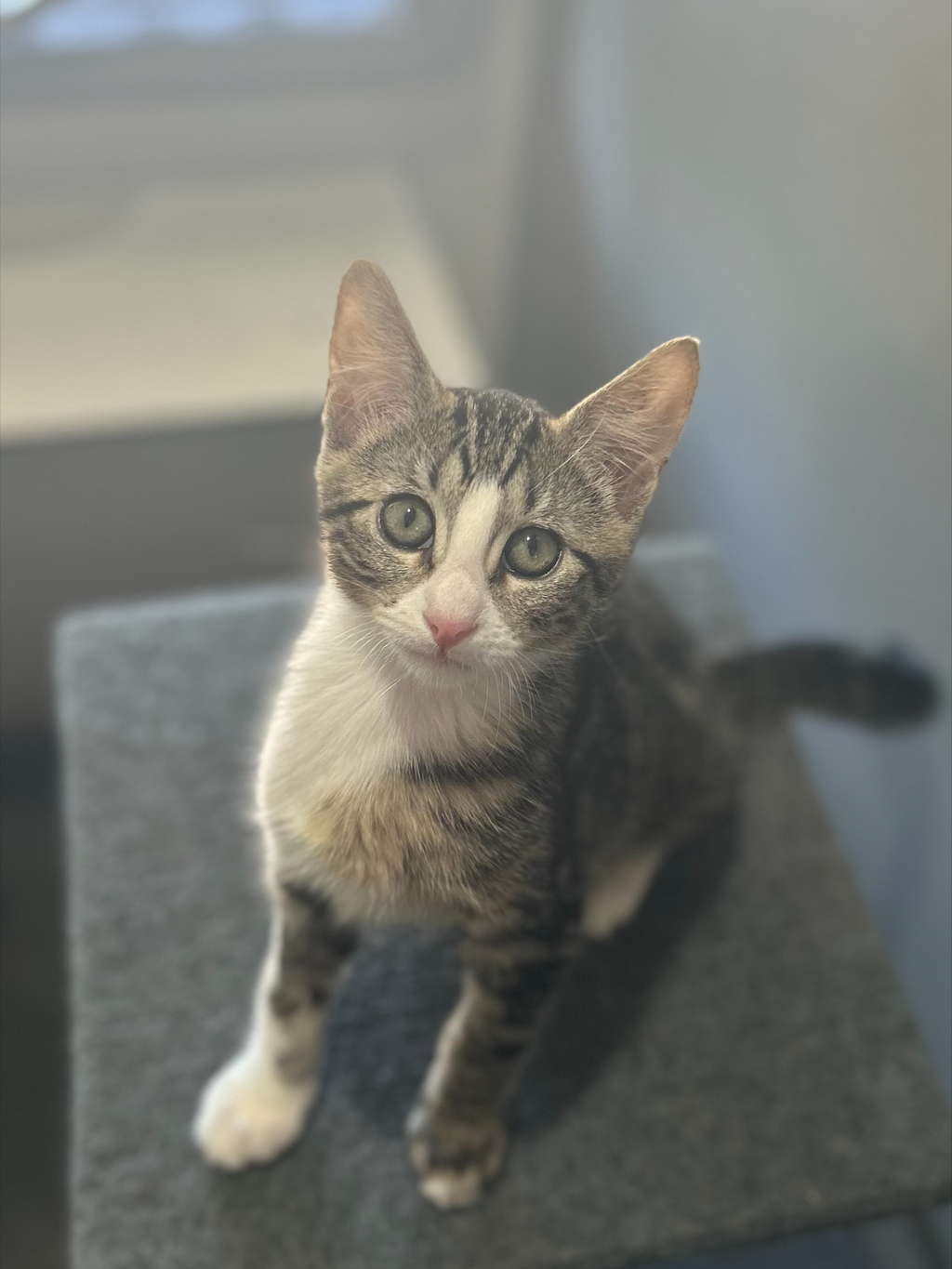 I'm still a kitten, full of curiosity and boundless energy.I'm quite friendly and gentle, always ready for a cuddle or a warm lap to nap on.I'm good at making friends, whether they're humans or other cats. I'm more than just a kitten; I'm a companion, a confidant, a little bundle of joy. I'm looking for a home where I can share my love and playfulness. Adopting me means gaining a loyal friend who'll brighten your days with my antics and purrs and be king of the castle. You won't regret welcoming me into your life!