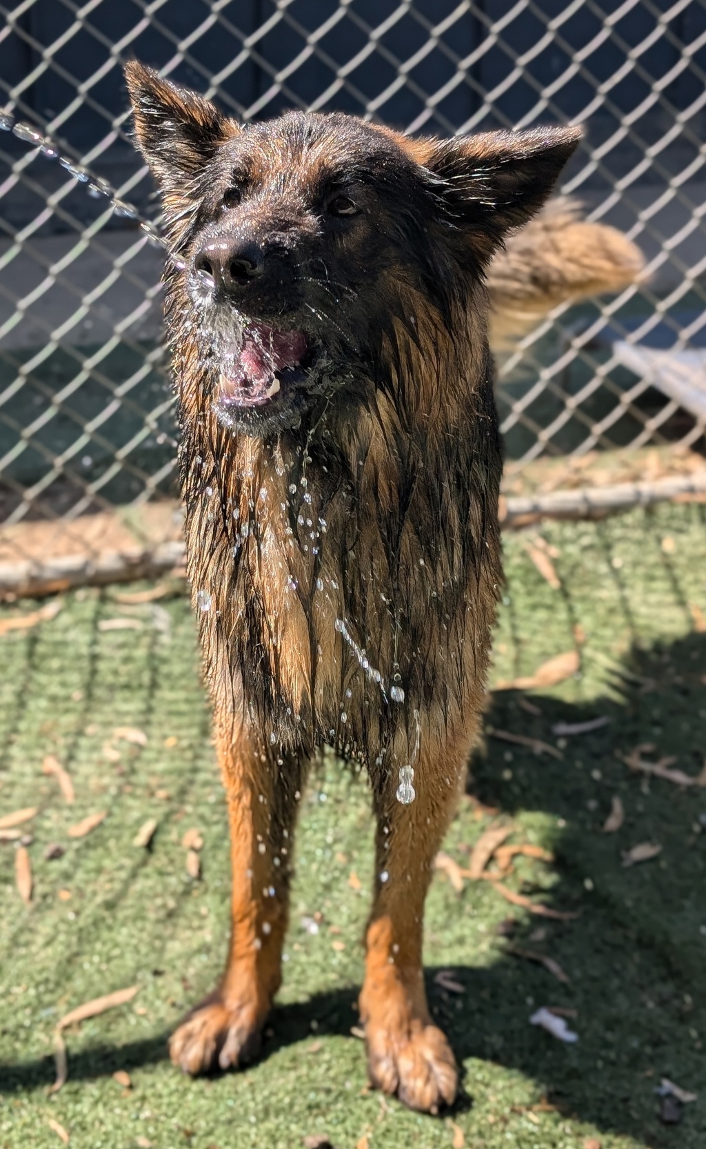 Achilles loves playing with water, especially when the hose comes out! If you're planning to water the garden, be prepared to either pop him away or enjoy watching him leap through the sprays with pure joy. The water is his playground, bounding and splashing through the stream like a playful pup.