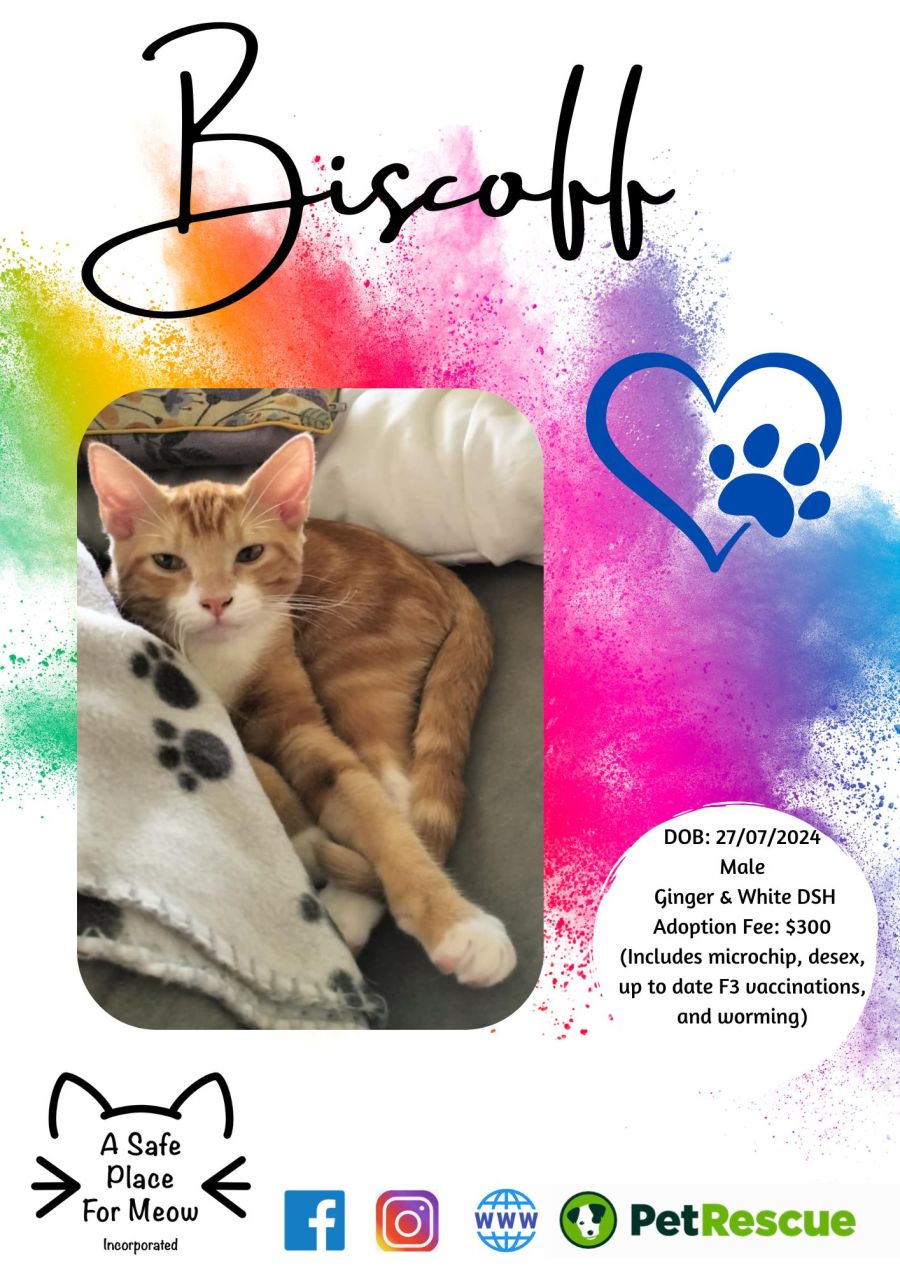 Biscoff is the best little cat! He is the perfect mix of playful, cuddly and chill. He is very confident and loves being around other animals, especially dogs, and isn't a cat who likes being alone so he would suit a house with other animals.