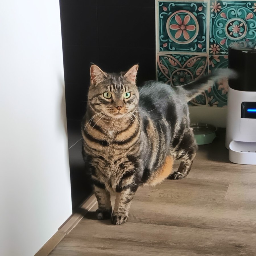 weighted 7.8kg, and although we’ve kick started her weight loss journey, she will always carry a soft jiggly pouch. Thankfully, she’s not obsessed with food and will sit by her bowl waiting patiently for her meals.